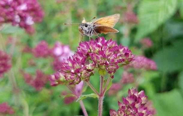 wie Wasserdost, Scharfgarbe, Wilde Malve, Königskerze, Kartäusernelke, Glockenblume, Traubenkopf-Leimkraut, Färberkamille, Beinwell, Fetthenne, Rainfarn, Mädesüß, Taubnessel, Wegwarte und Zaunwicke.