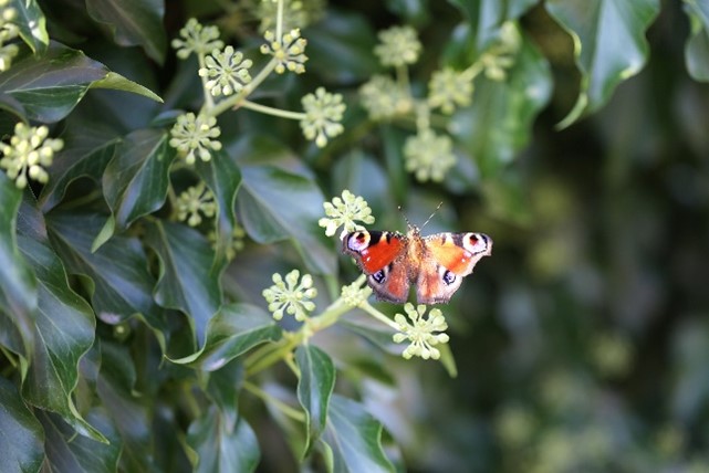 - Spätblühende Sträucher wie Faulbaum, Liguster, Färberginster und die Altersform des Efeus